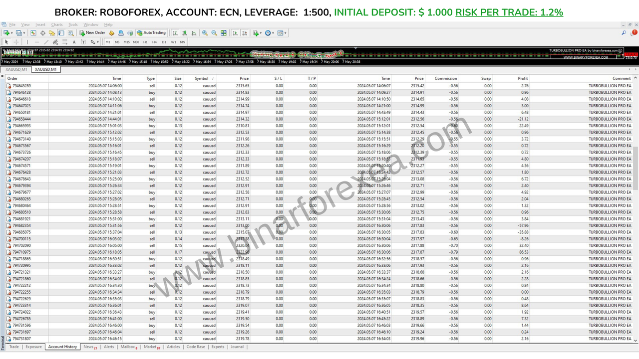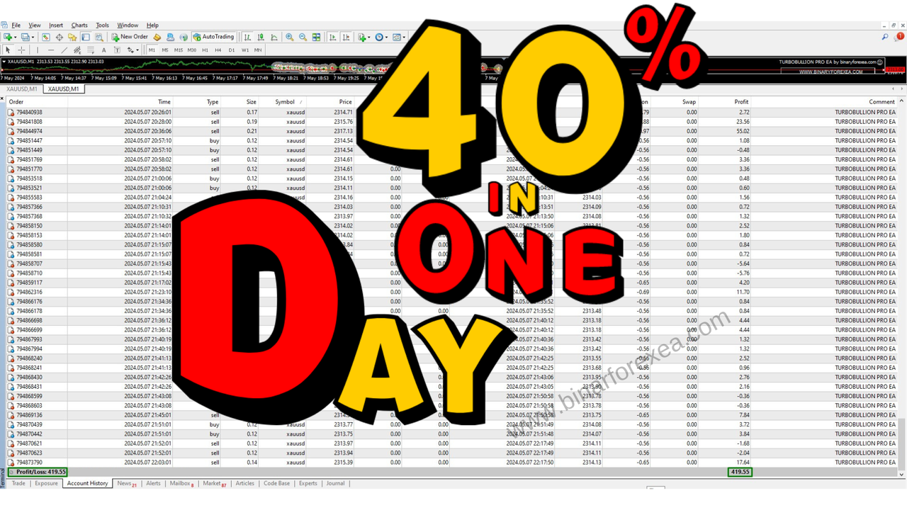 - TURBOBULLION PRO EA has generated $420 in 1 day (8 hours), representing 40% of the initial capital